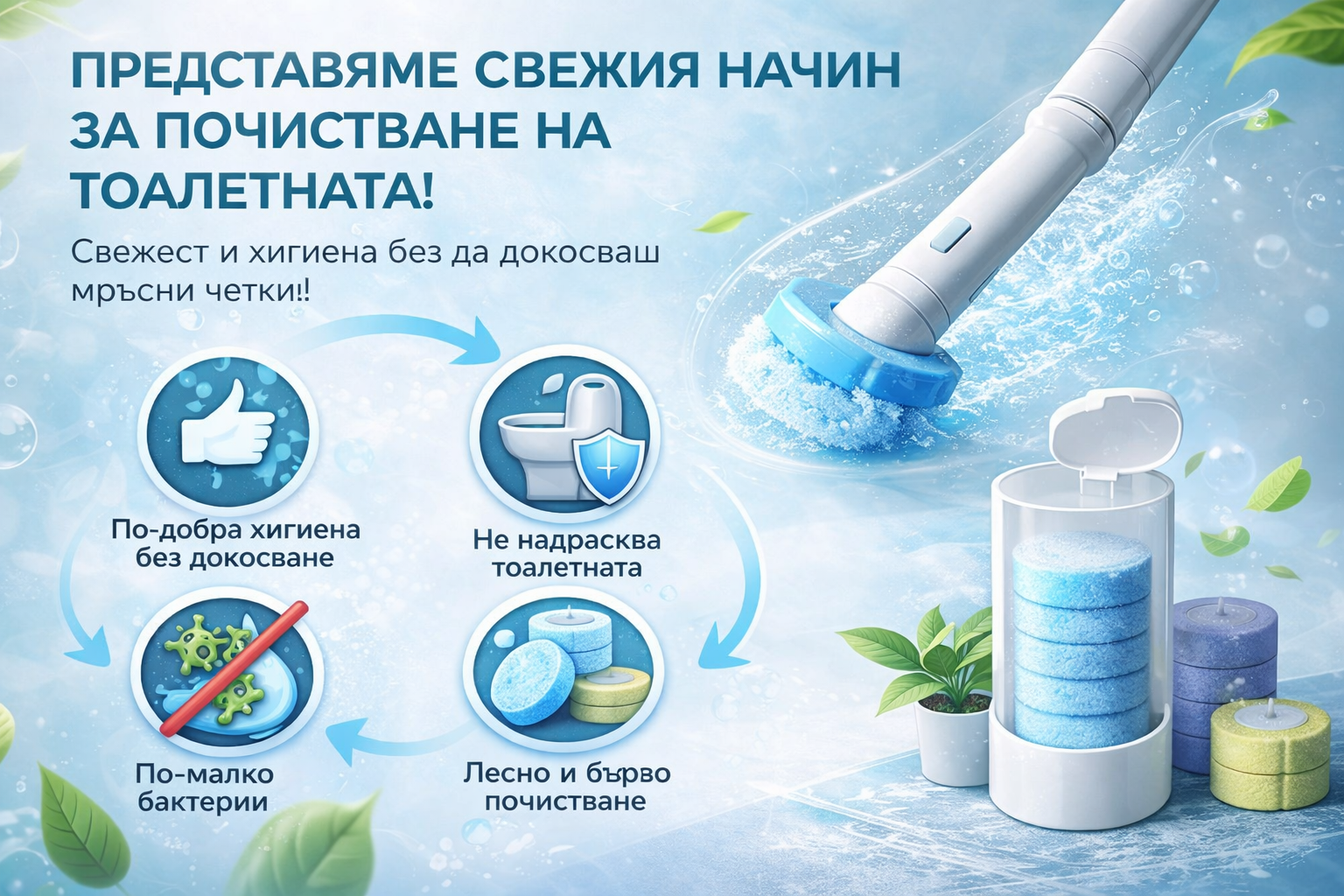 FreshFlush е комплект за хигиенно почистване на тоалетна с еднократни почистващи гъбички, който позволява почистване без директен контакт с мръсотията.